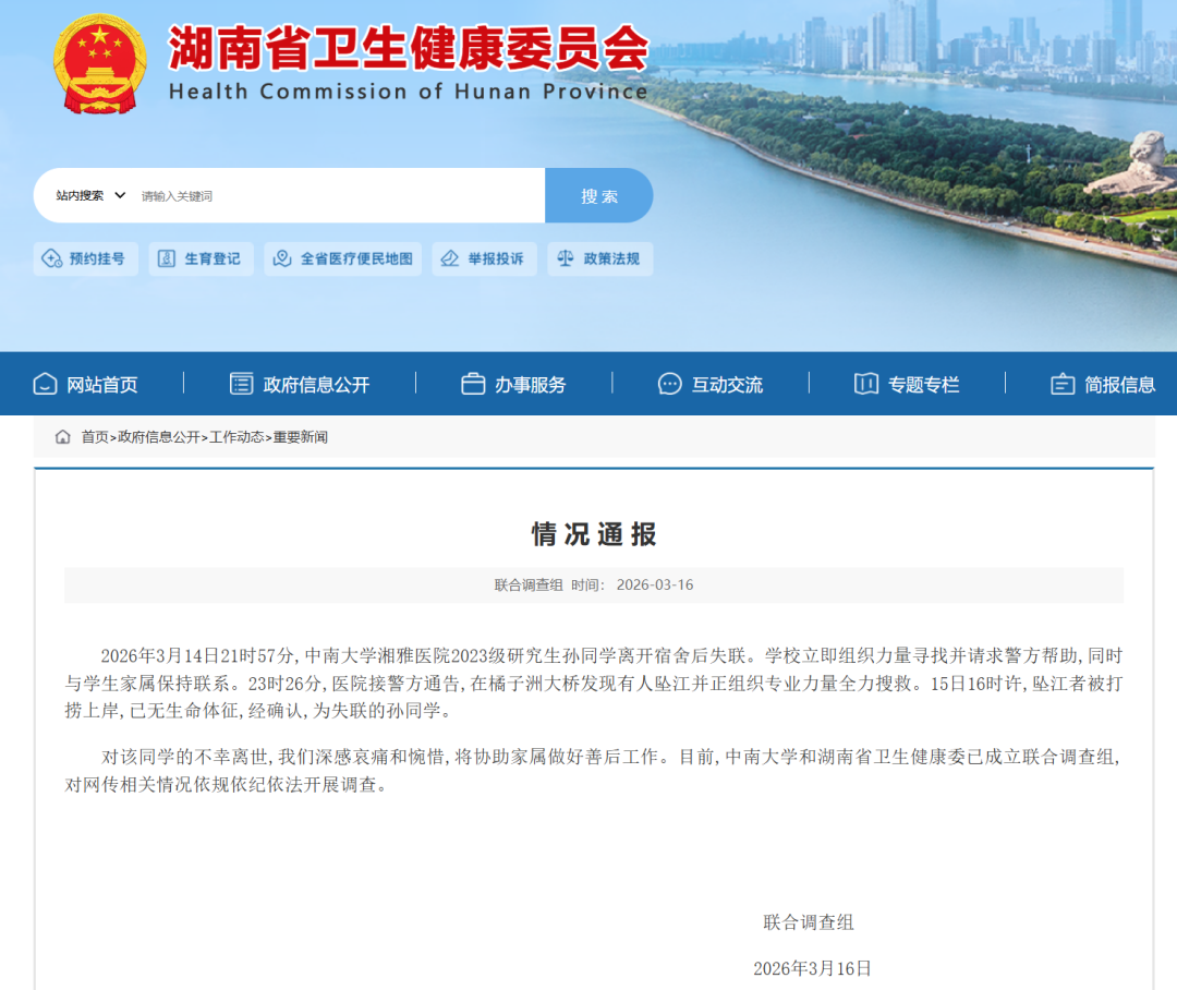通报显示,3月14日21时57分,中南大学湘某医院2023级研究生孙某离开宿舍后失联。23时26分警方通报,在橘子洲大桥发现有人坠江并组织搜救。
