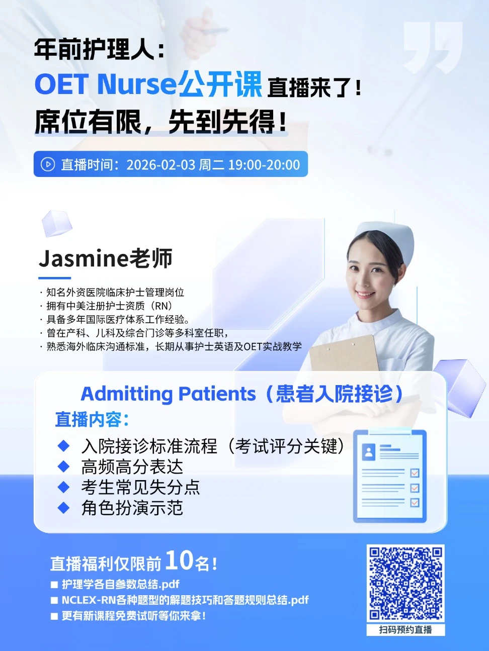 这场直播,我们将通过标准流程拆解+角色扮演示范,把Admitting Patients的每一个加分点、扣分点讲清楚。